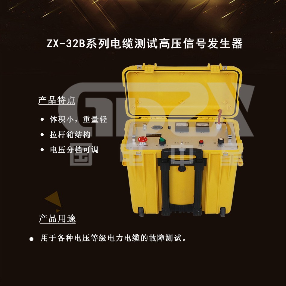 ZX-32B 電纜測試高壓信號發生器為電力電纜的故障測距和精確定點提供高壓信號源,可用于各種電壓等級電力電纜的故障測試。應用現代電力電子技術,采用高頻高壓電源設計,體積小,重量輕。